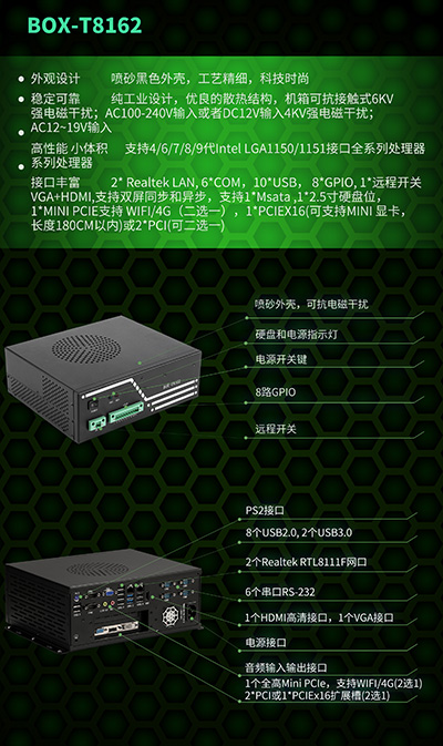 BOX-T8162是一款高性能、小體積、可擴(kuò)展工控機(jī),桌面式或壁掛式安裝,降低了機(jī)箱內(nèi)部噪聲,同時(shí)增加了GPU散熱通道。BOX-T8162支持Intel® LGA1150/1151針腳的第4/6/7/8/9代全系列處理器,支持高性能浮點(diǎn)運(yùn)算,速度最快可以達(dá)到128GFLOP/s。支持?jǐn)U展全高半長(zhǎng)的擴(kuò)展卡,多擴(kuò)展總線提供良好擴(kuò)展性能。機(jī)箱可抗接觸式6Kv強(qiáng)電磁干擾,整機(jī)小巧,功能強(qiáng)大,適用于工業(yè)物聯(lián)網(wǎng)、機(jī)器視覺(jué)等應(yīng)用。