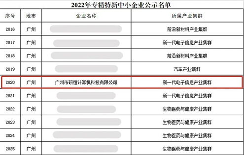 近日,廣東省工業(yè)和信息化廳正式公布2022年專精特新中小企業(yè)入選名單,經(jīng)專家綜合評定并公示,廣州市研恒計算機科技有限公司(以下簡稱“廣州研恒”)榮獲“廣東省專精特新中小企業(yè)”稱號,充分展示了廣州研恒的自主創(chuàng)新力與核心競爭力。